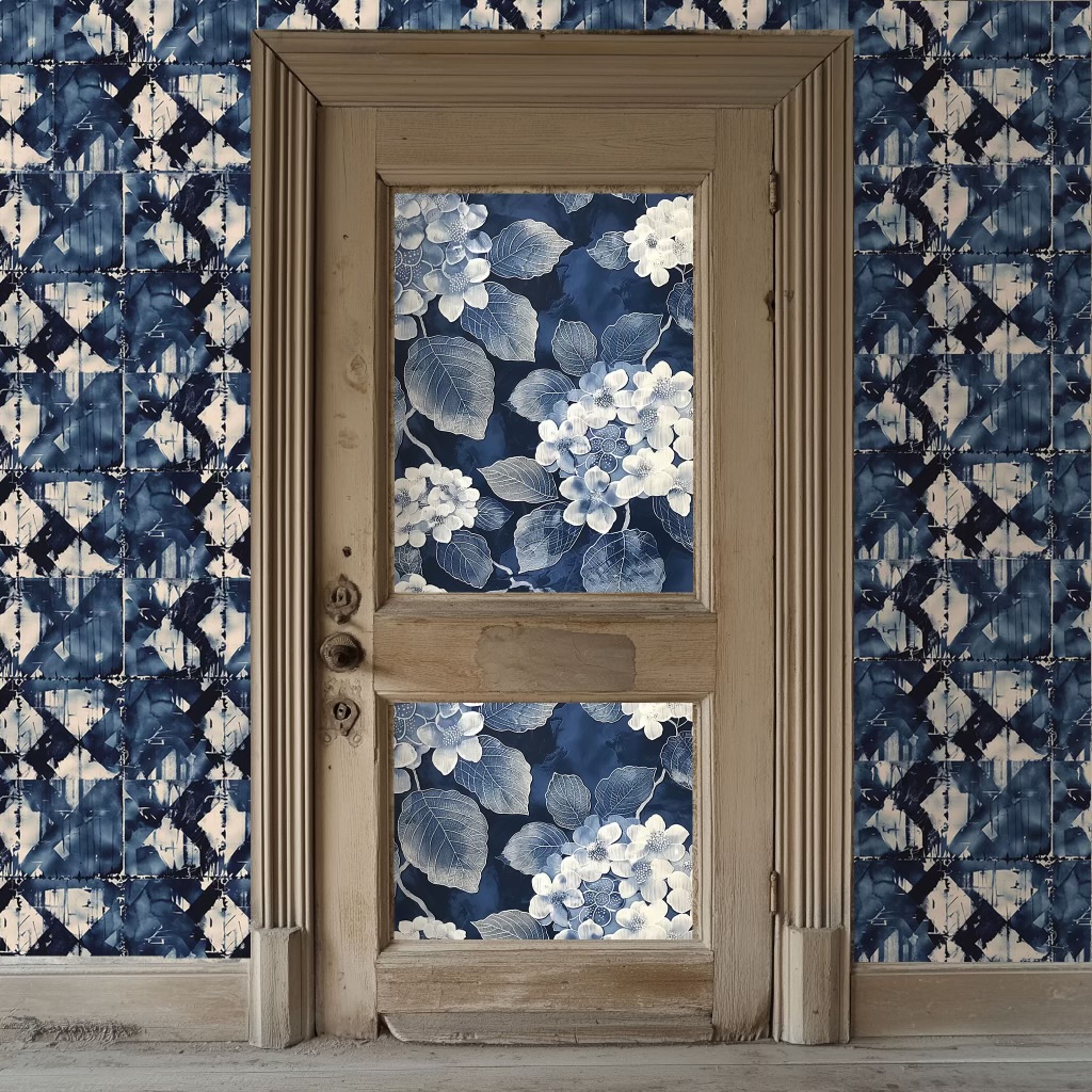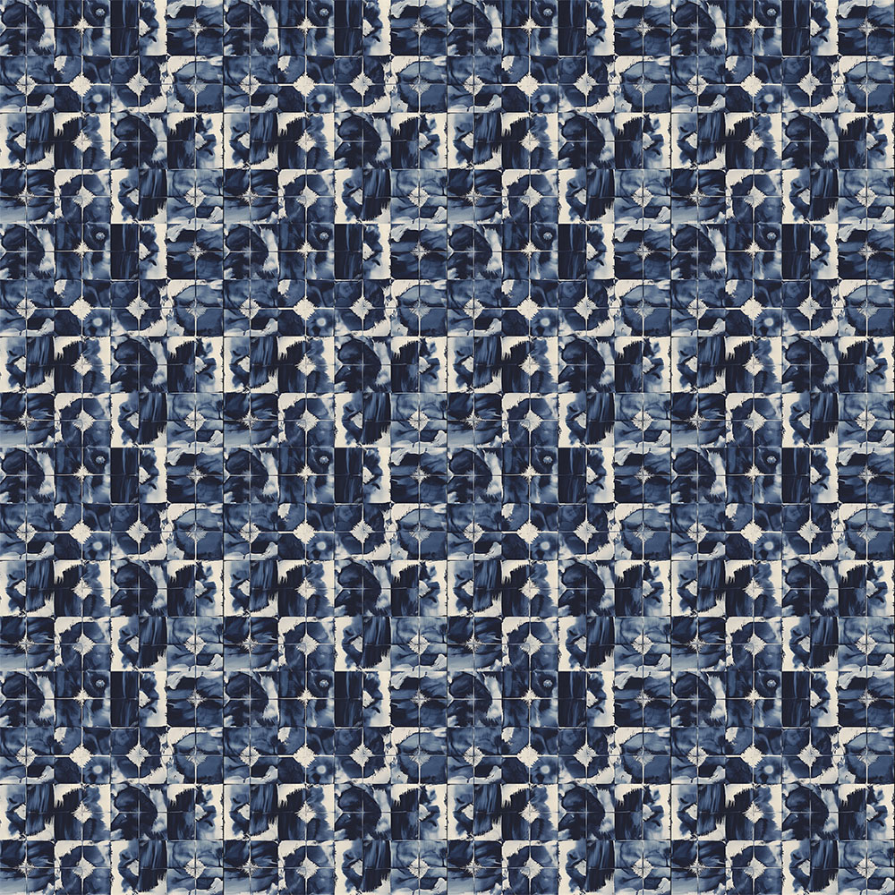 Available individually (one 48×48 cm sheet of wallpaper) or in a box of 16 sheets of wallpaper Unique artistic rendering, inspired by Japanese cyanotypes and shibori Easy to hang or frame.
