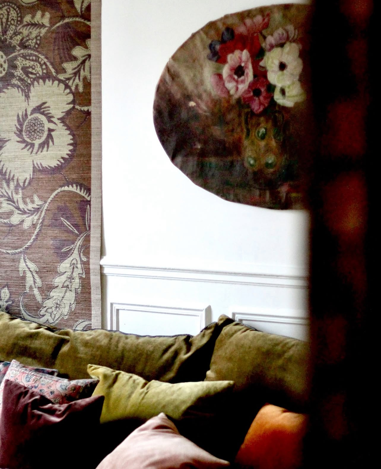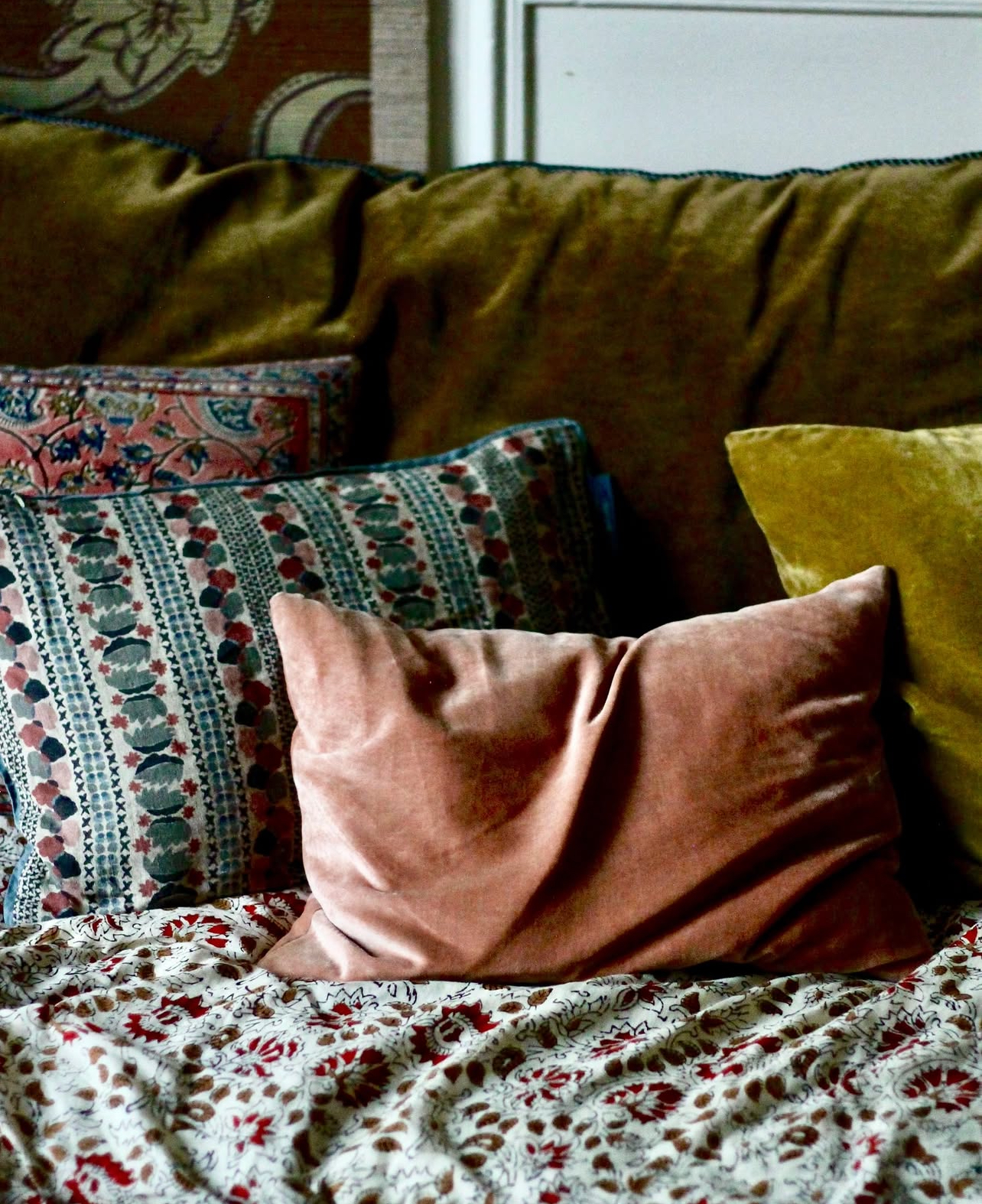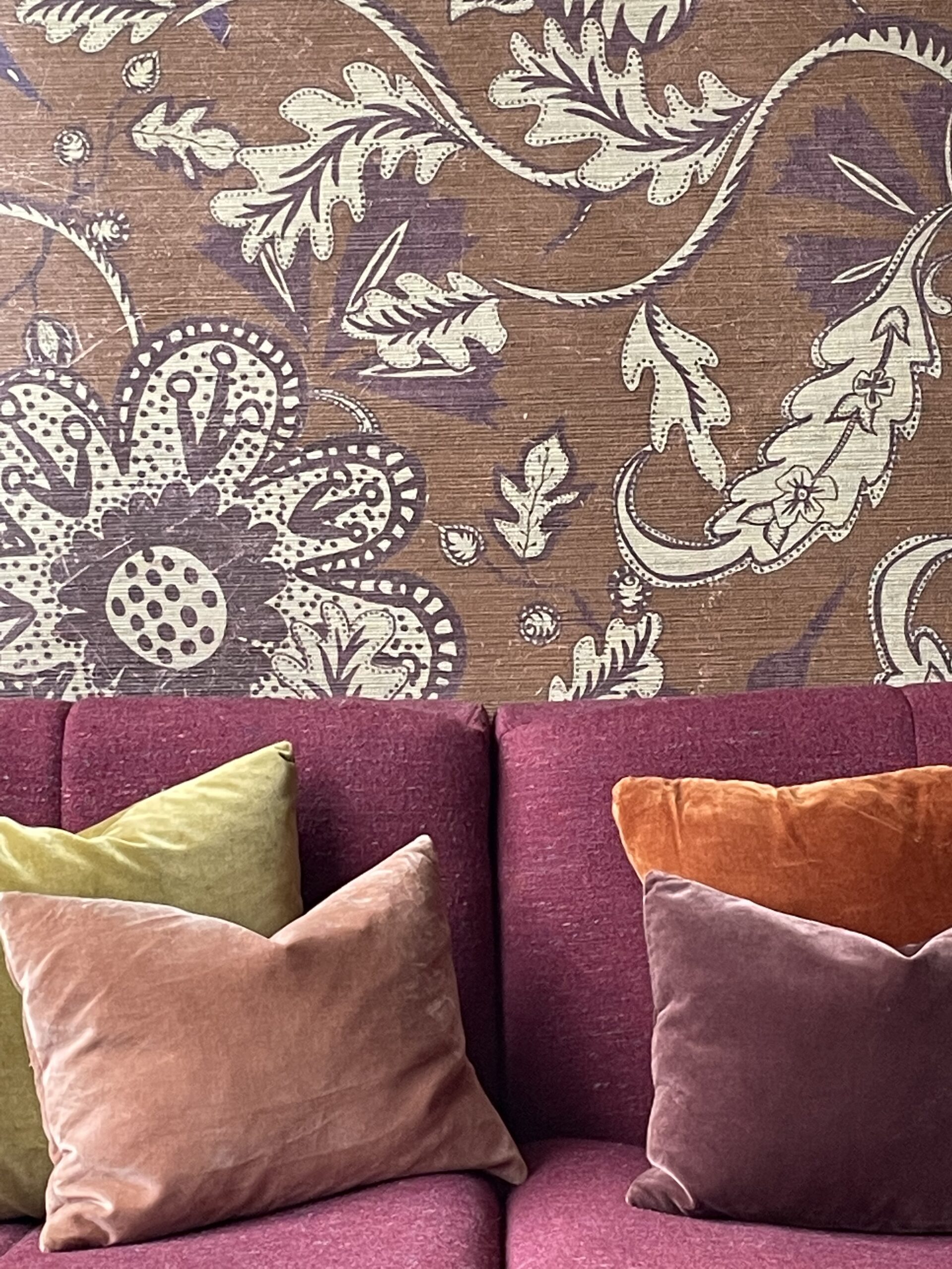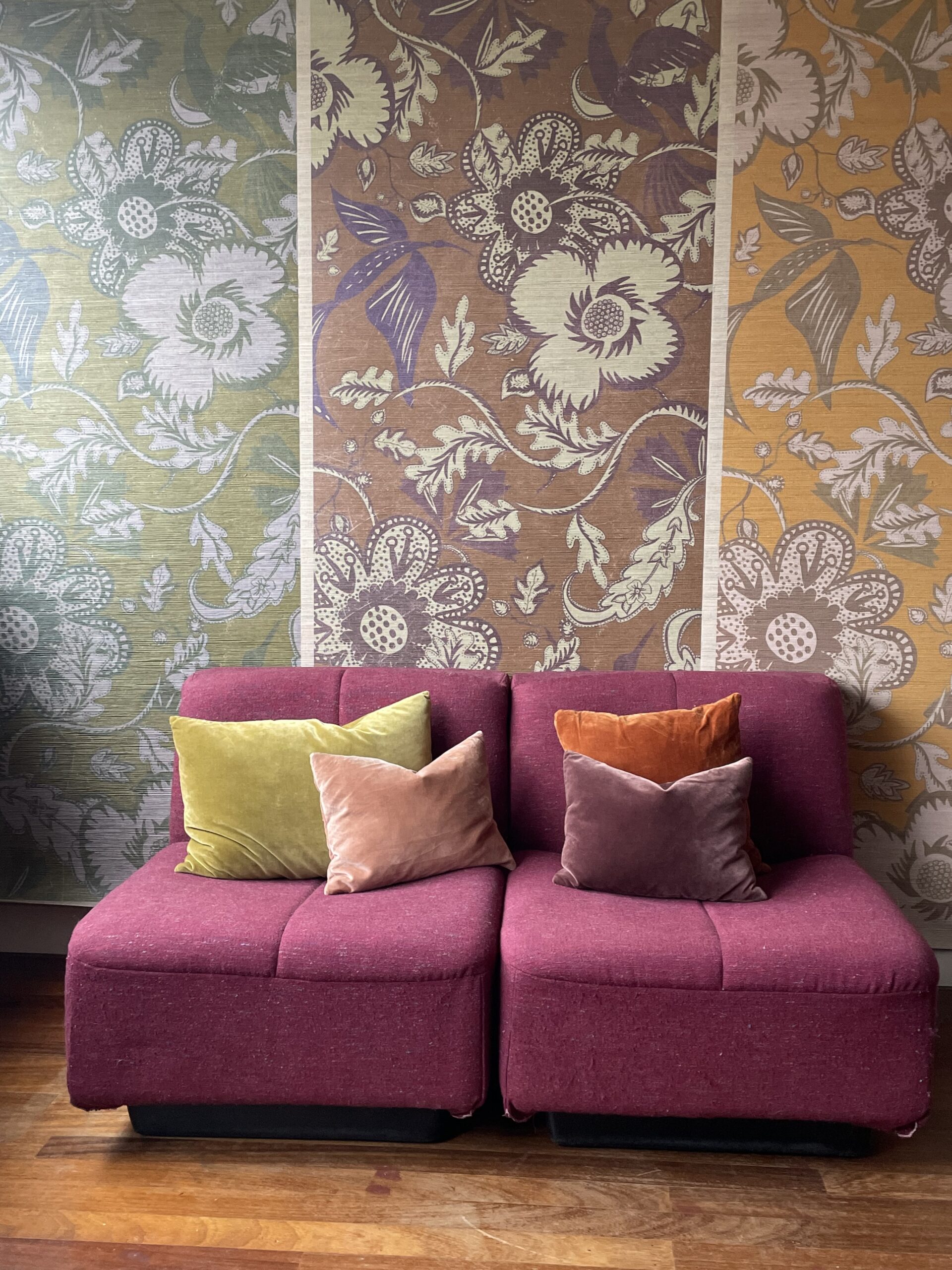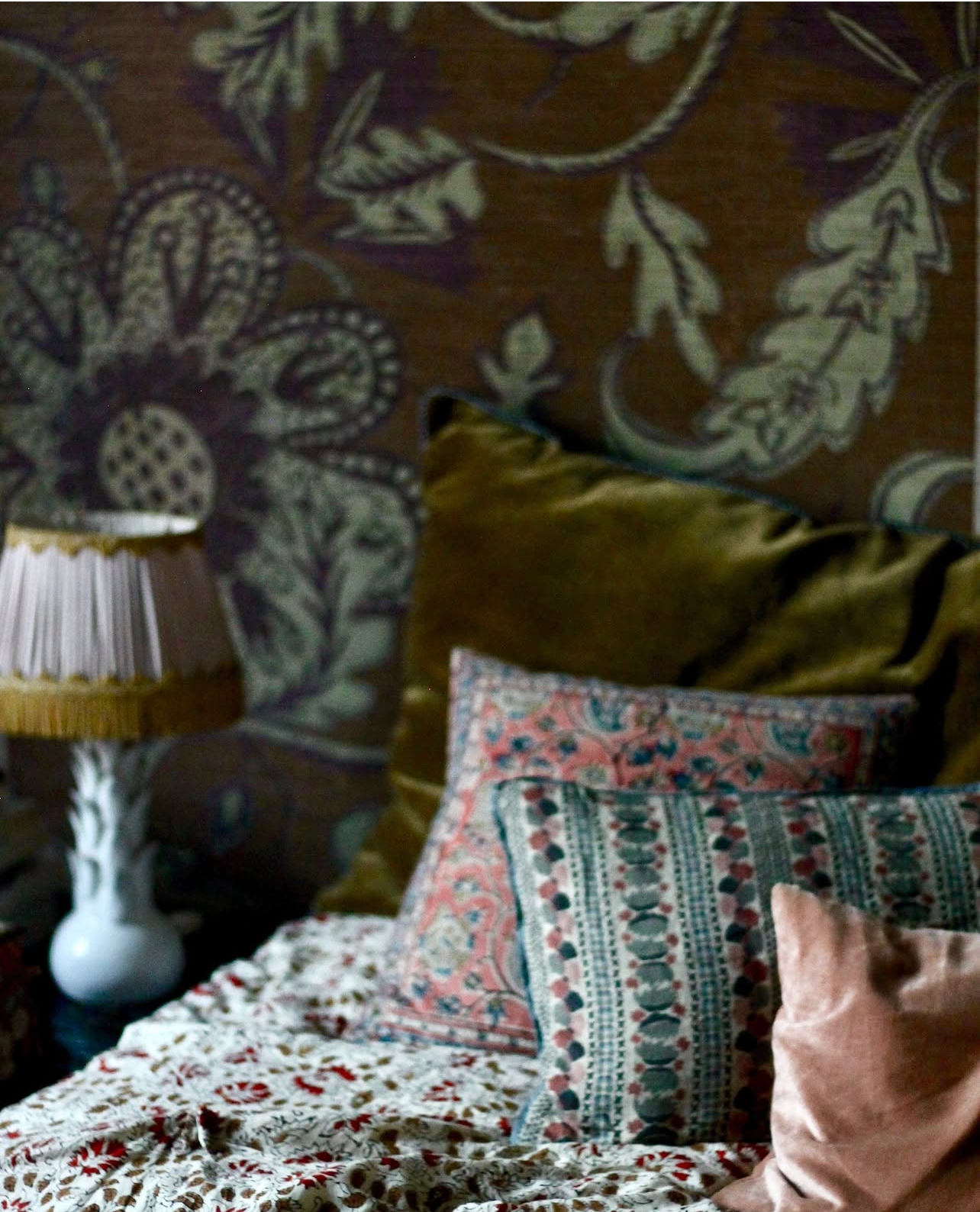 L’indienne jaune, verte ou mauve : une réinterprétation contemporaine et gourmande du motif floral traditionnel, en coloris absinthe, miel ou prune.