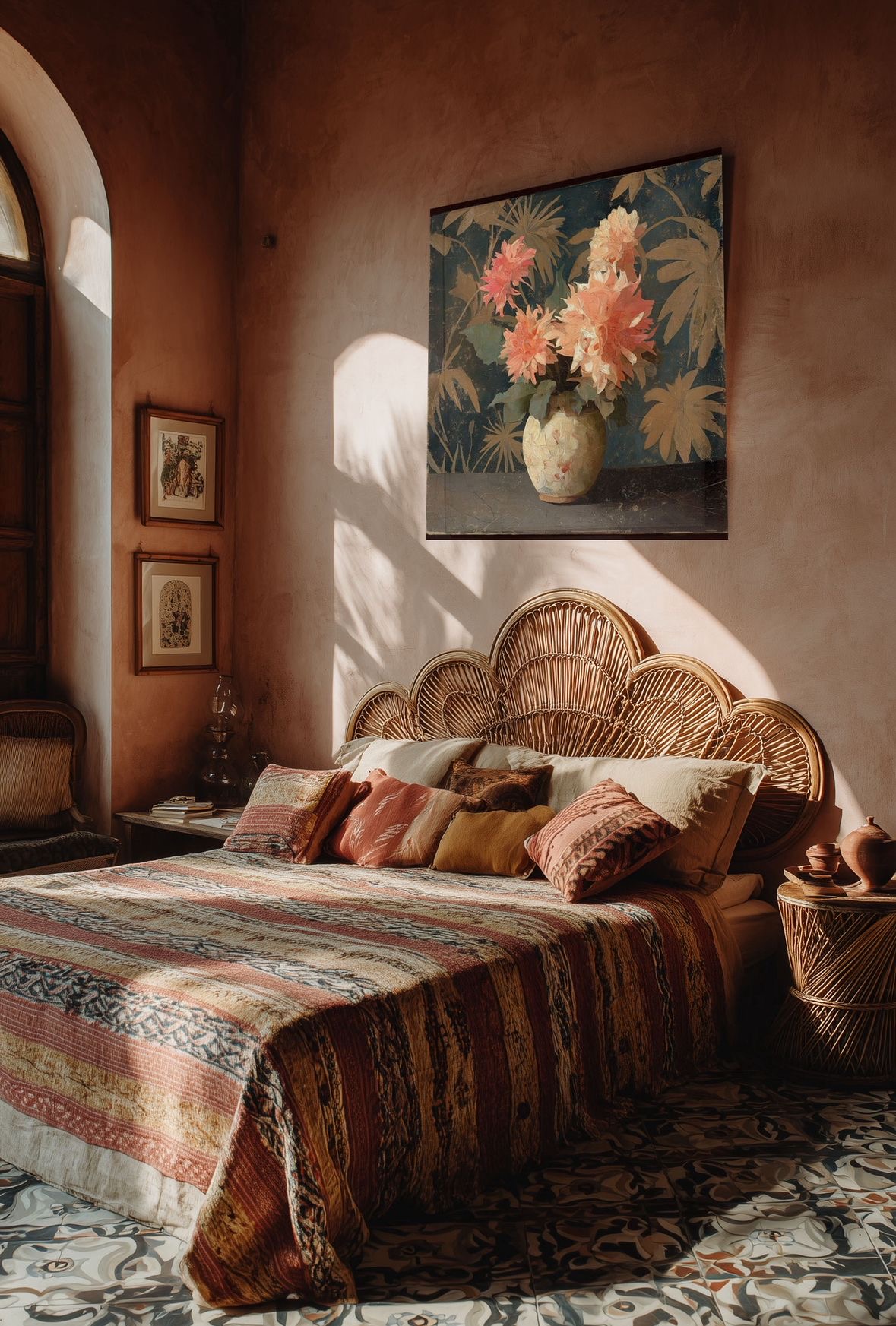 Toile murale artisanale unique à suspendre, représentant un bouquet de fleurs pour une déco poétique et fait main.